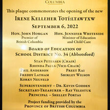 On September 20, 2022, the Abbotsford Board of Education hosted the official grand opening event of Irene Kelleher Totí:ltawtxw, the newest elementary school in the Abbotsford School District. Over 100 guests - including school trustees, government officials, district staff, students, and various community members - were in attendance to commemorate this exciting day, learn more about the building process and the history of the school's namesake, Irene Kelleher.